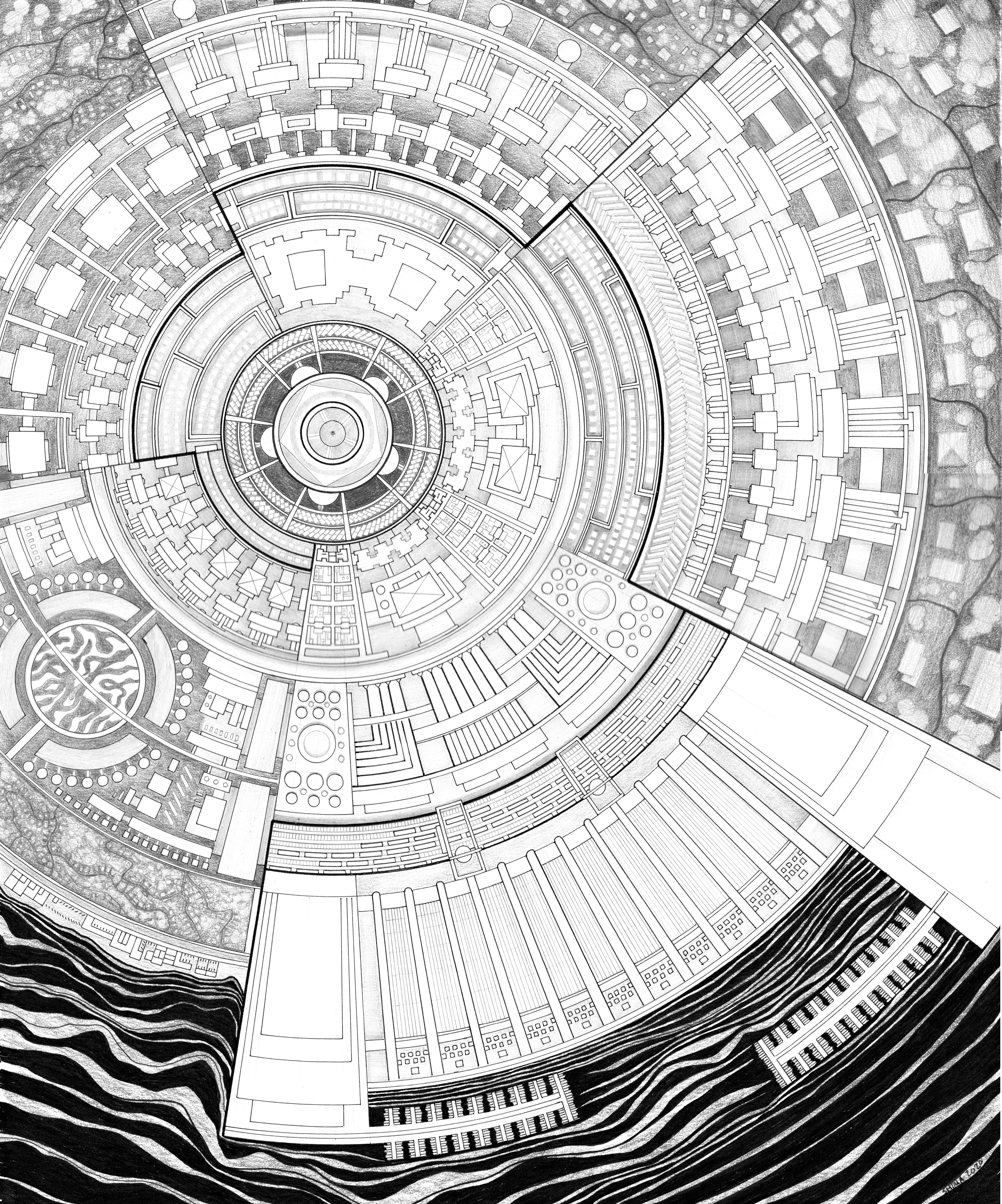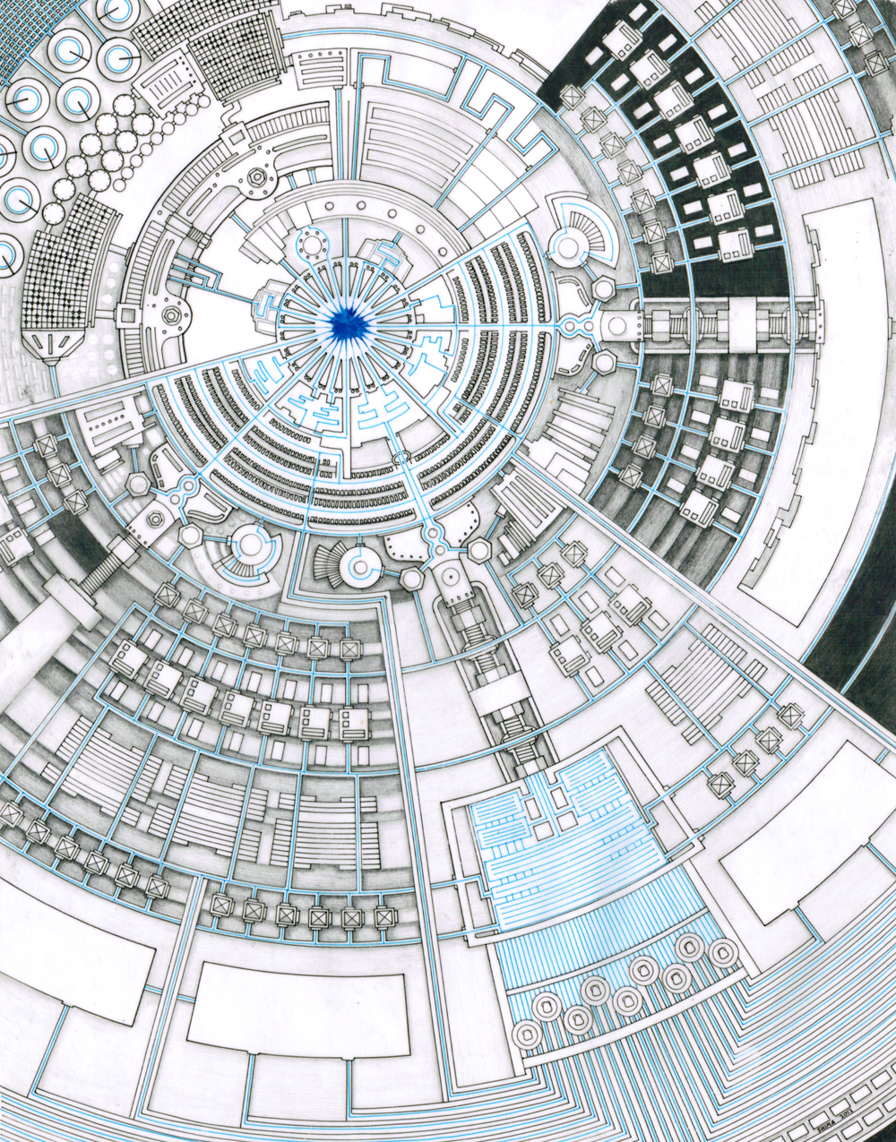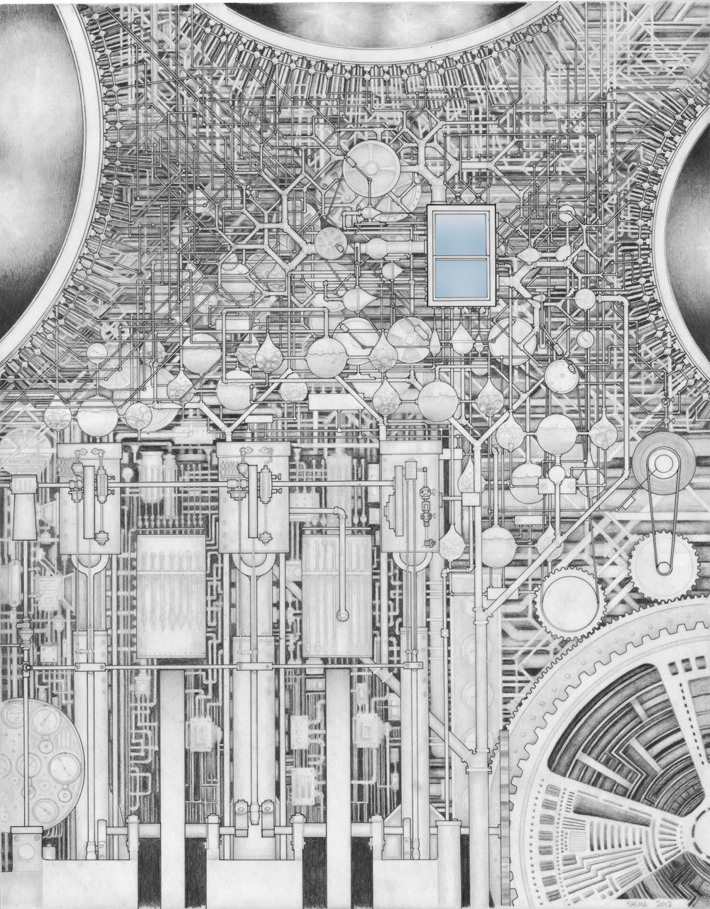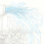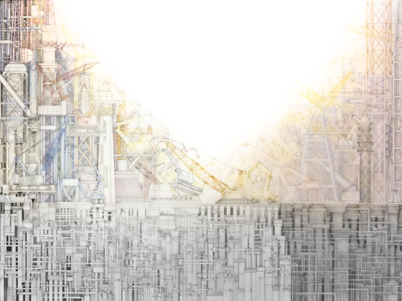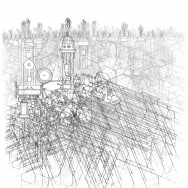 This series of drawings tell the story of a world very similar to our own. Made using architectural drafting techniques, they explore how using a system of simple rules (restricting the angles of lines, repeating components, fractal logic) can yield a seemingly complex, even chaotic, design that transcends the sum of its constituent rules. The primary graphic device is the line, indicating movement and trajectory. Through the composition of density, emptiness, and a tonal range of line weights, the lines give way to a reading of deep, three-dimensional space.