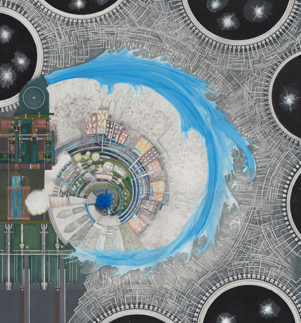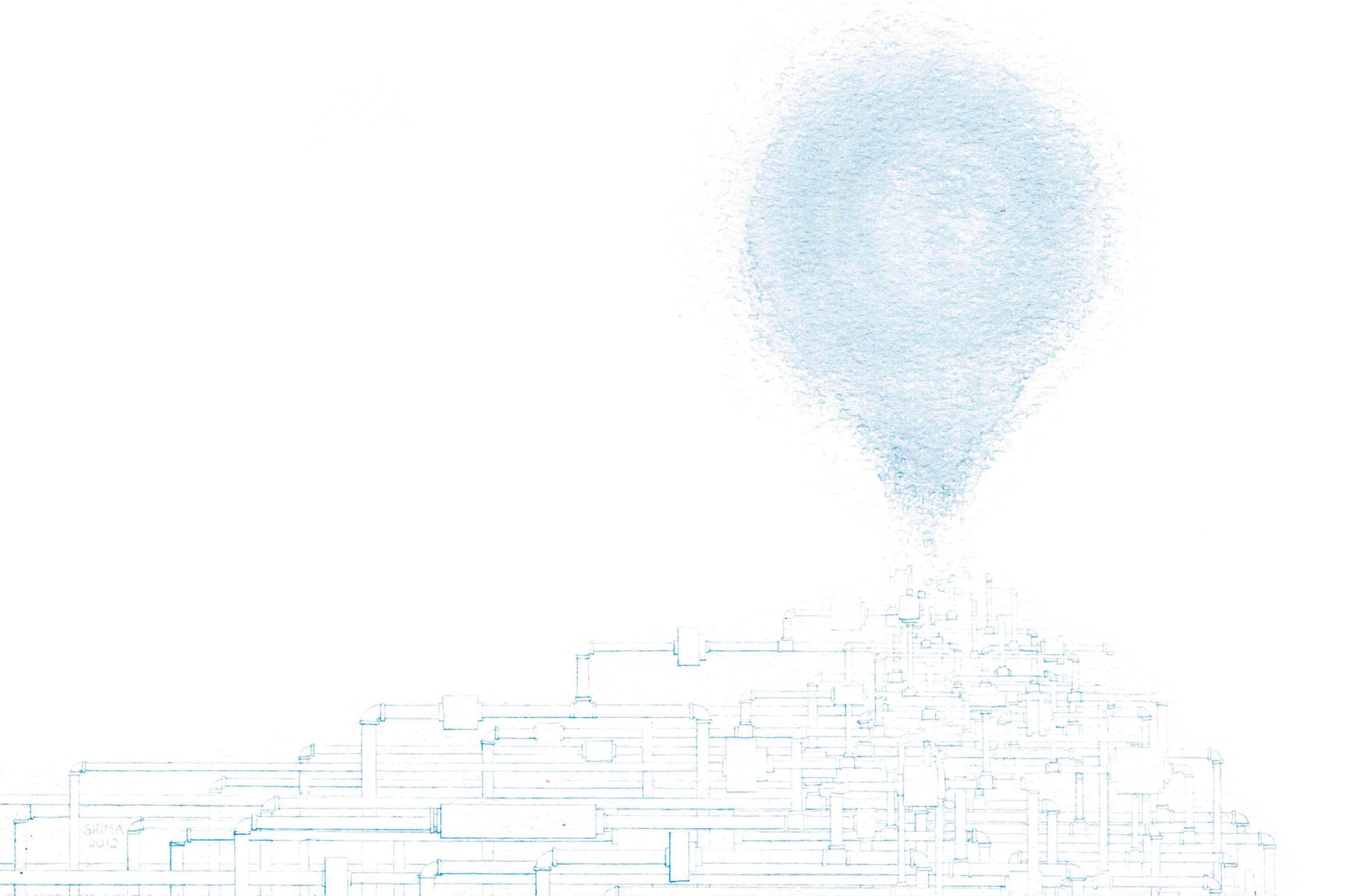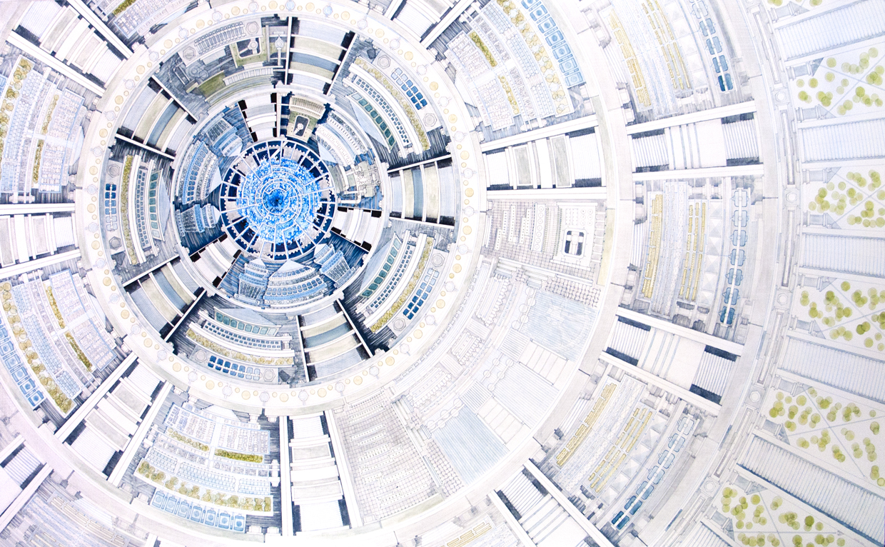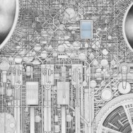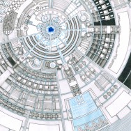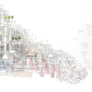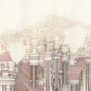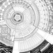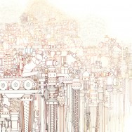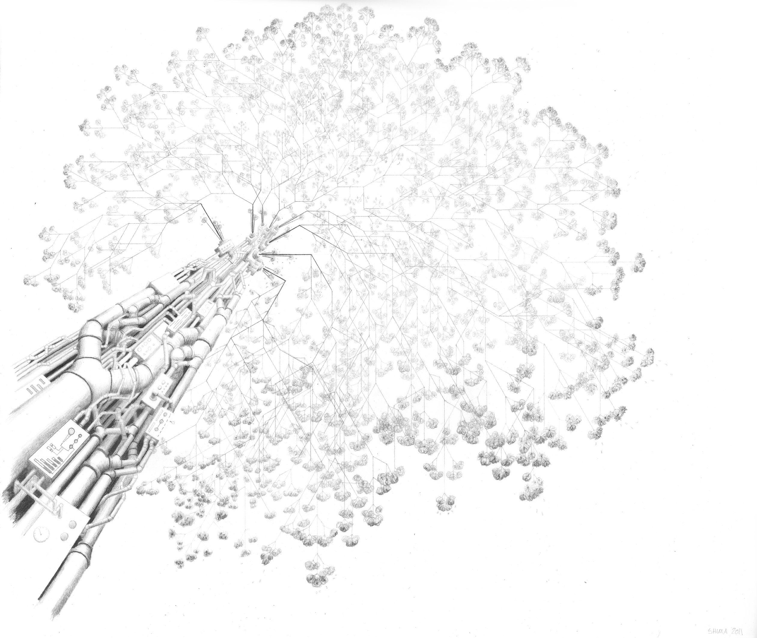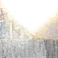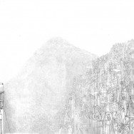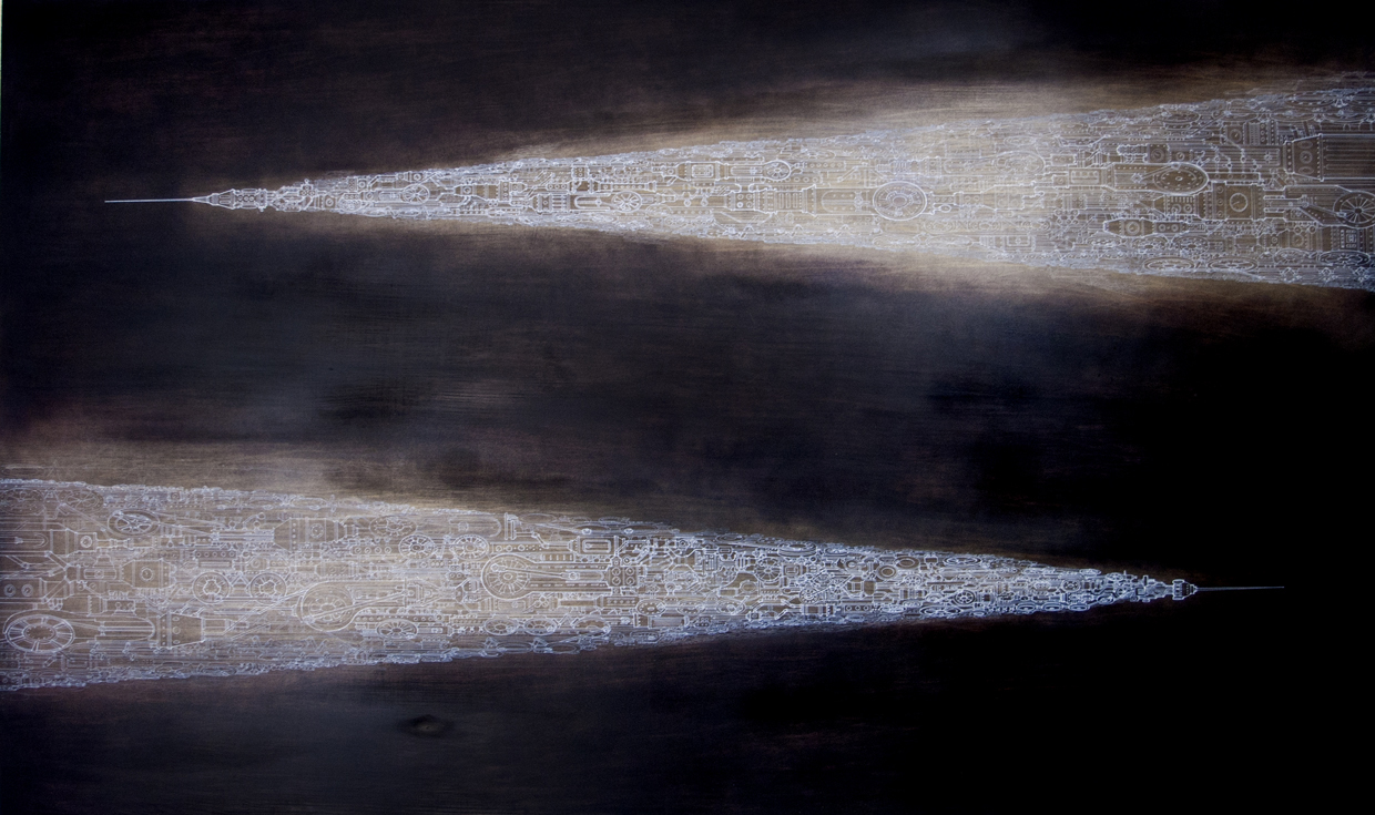 This series of drawings tell the story of a world very similar to our own. Made using architectural drafting techniques, they explore how using a system of simple rules (restricting the angles of lines, repeating components, fractal logic) can yield a seemingly complex, even chaotic, design that transcends the sum of its constituent rules. The primary graphic device is the line, indicating movement and trajectory. Through the composition of density, emptiness, and a tonal range of line weights, the lines give way to a reading of deep, three-dimensional space.