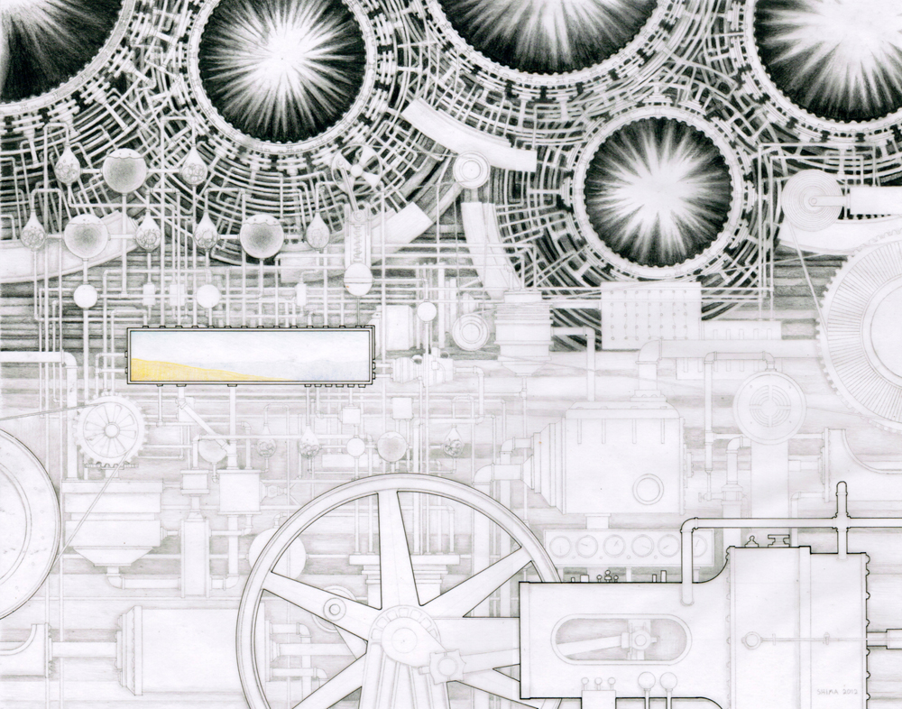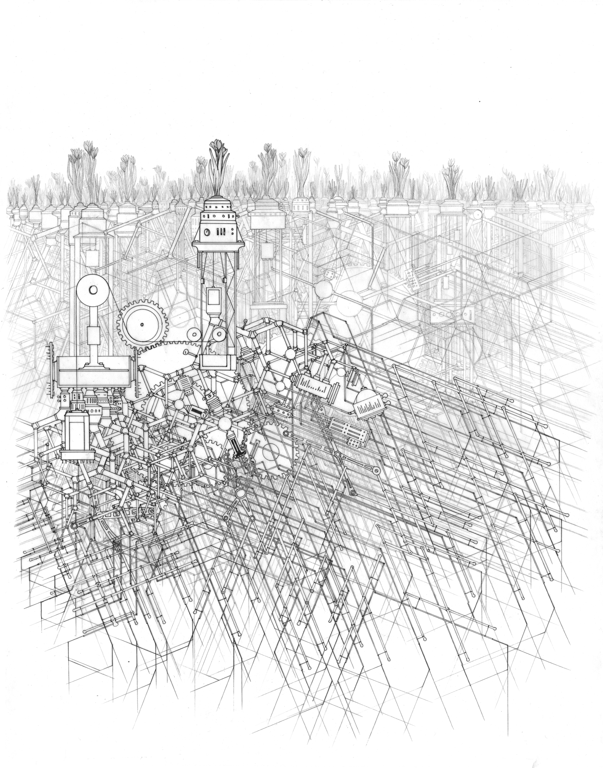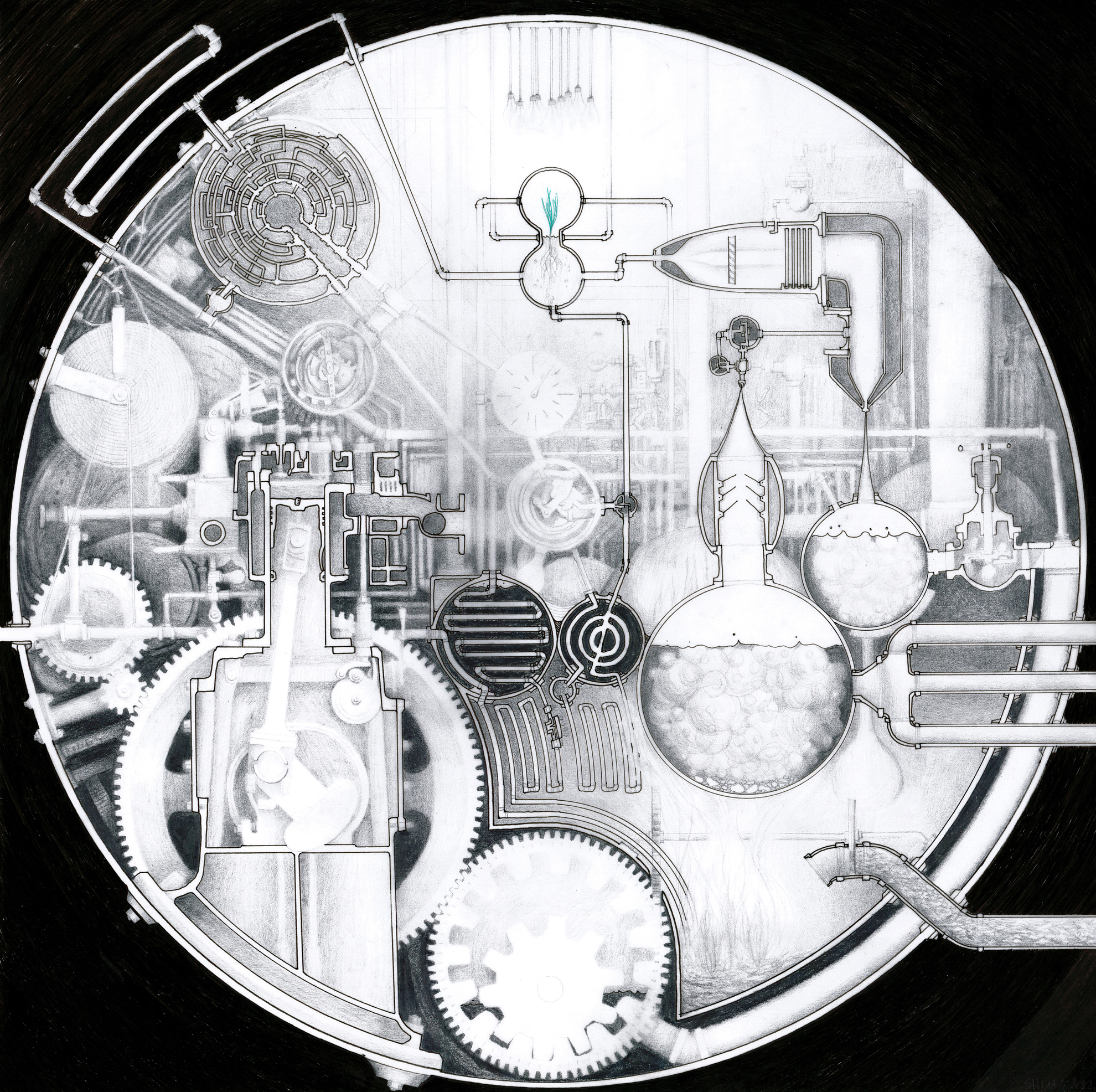 The drawings depict a world in which industrialized societies replace natural processes with artificial ones in order to produce materials for the sustenance and comfort of the inhabitants. Motors turn gears, belts, and pulleys; pumps extract water from the ground; and minerals are mined, transported, and refined. The machines have become so integral to the landscape and atmosphere that they cannot easily be separated or even distinguished. Boilers, beakers, and pipes become the root systems of trees, clouds are shrouded in water vapor by their wind-powered mist-making instruments, and entire landscapes are composed of their constituent mechanical parts.