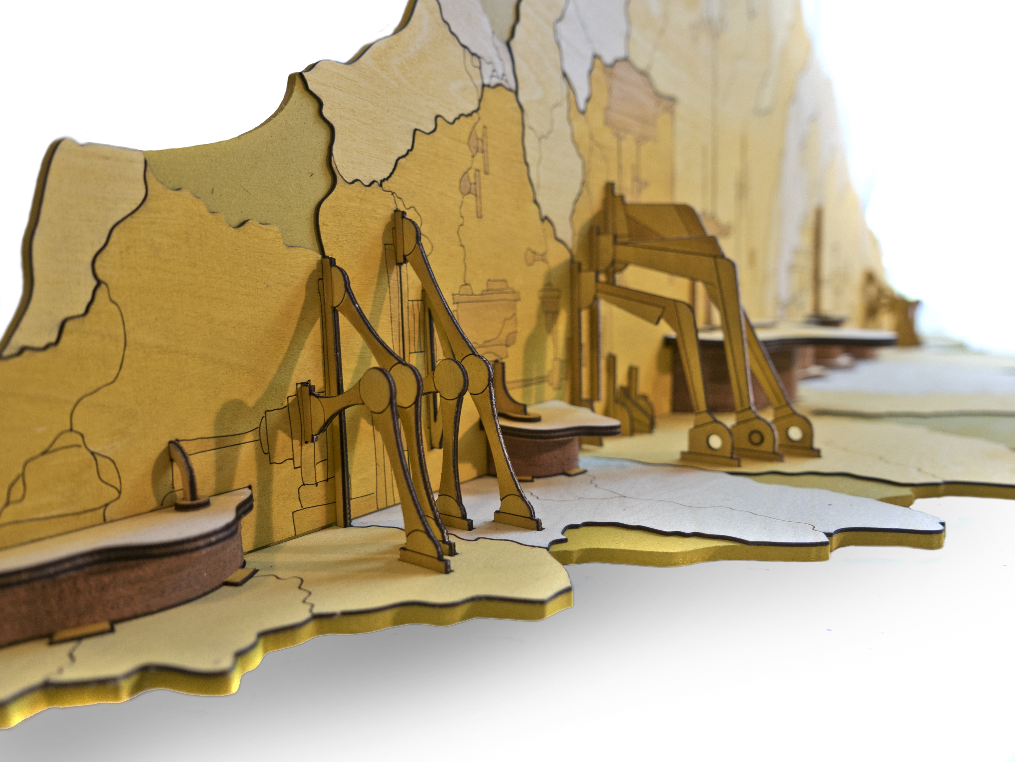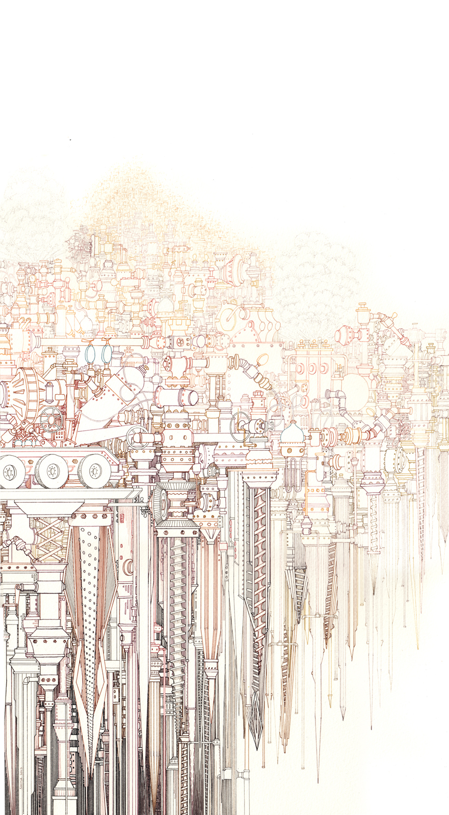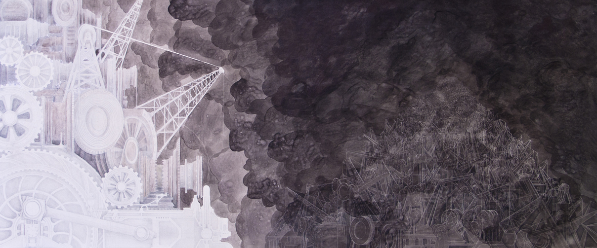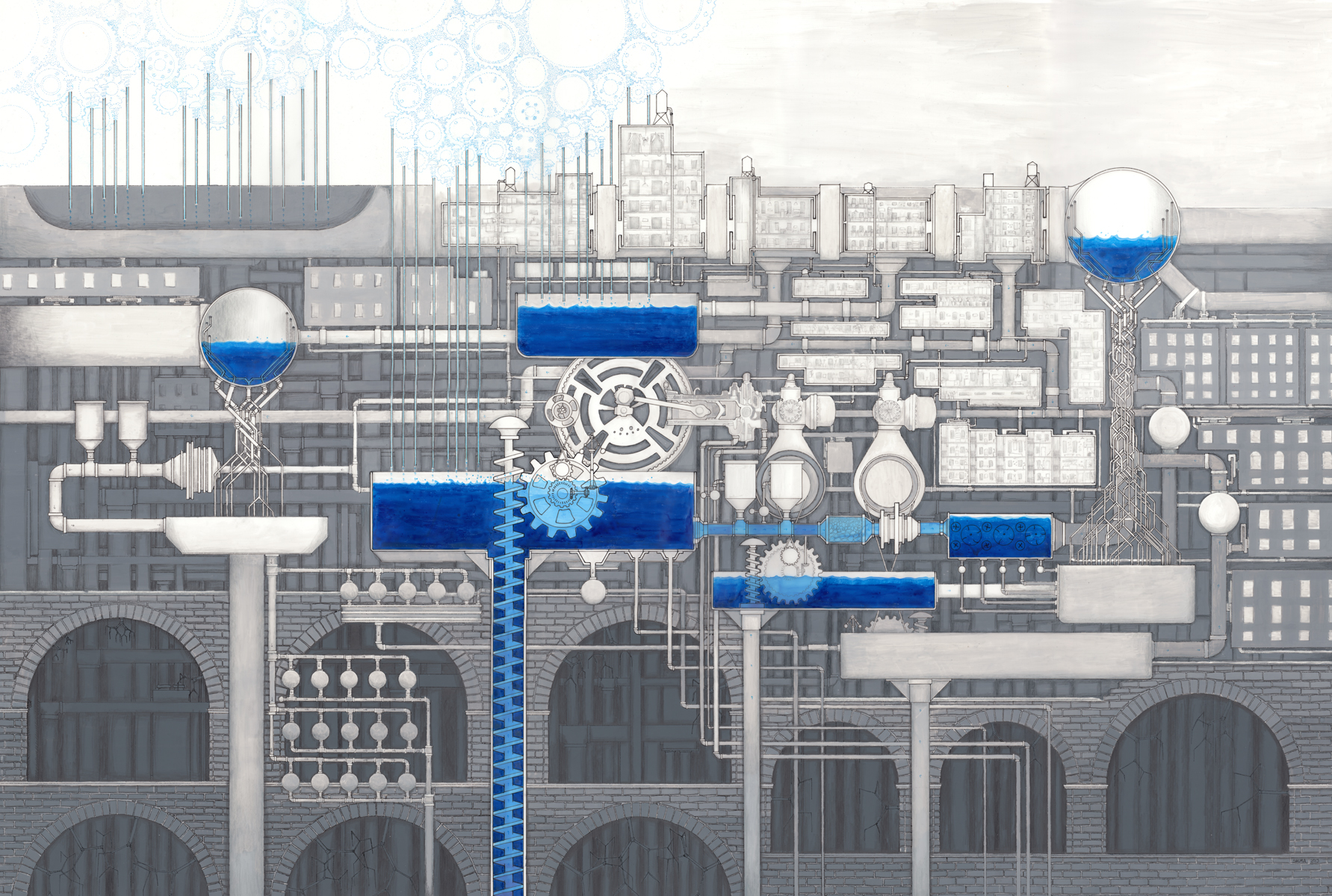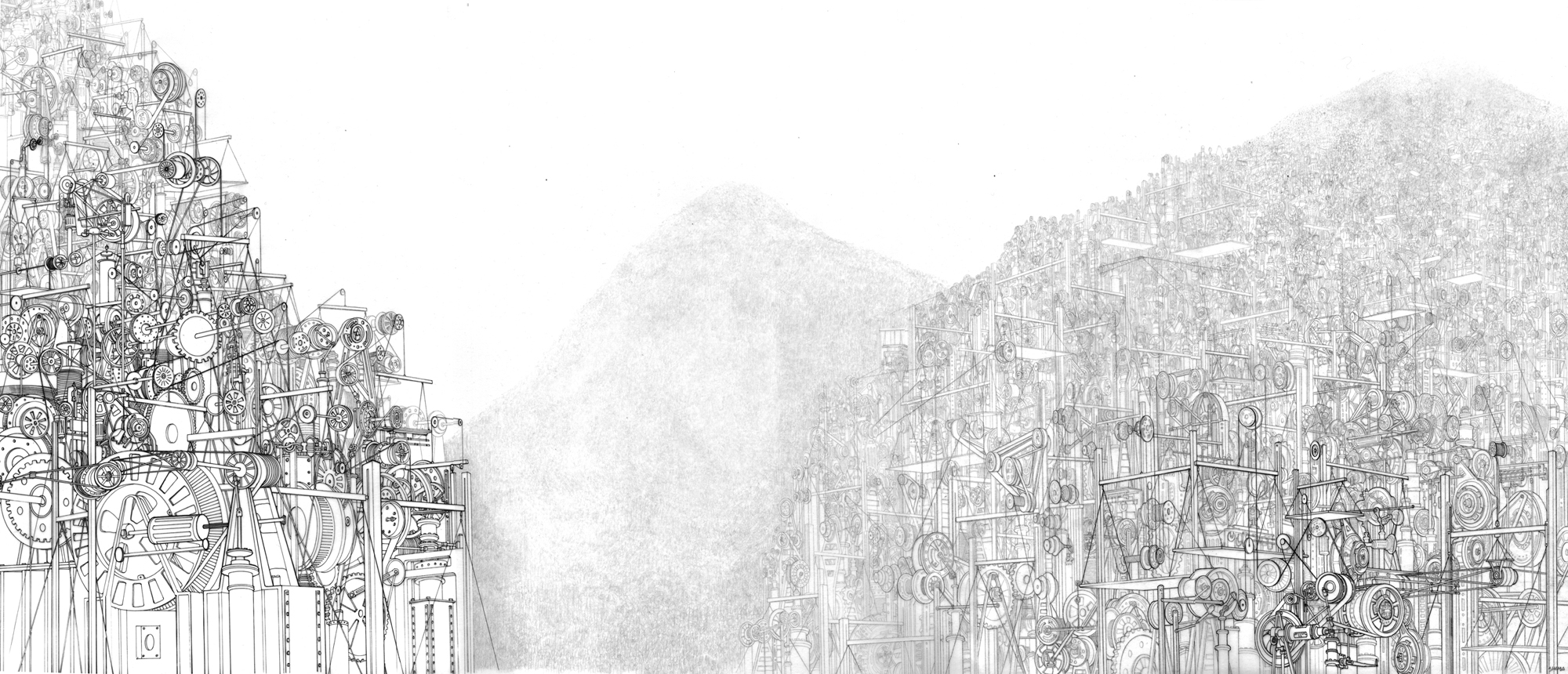Each scene is grounded in real machines and real processes, either present or past, but employed in fictional or hyperbolic ways. Parts of these mechanical landscapes are drawn with technical accuracy, in section or elevation, like architectural documentation, but the hand-drawn, illustrative quality of the technique adds depth, nuance, and mood, helping to draw out the narratives of the allegorical machines.