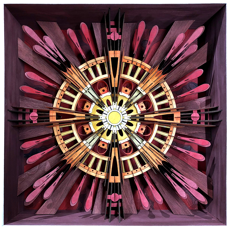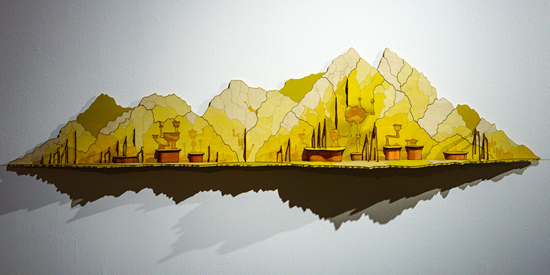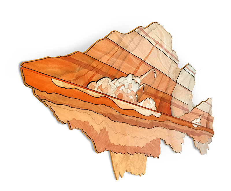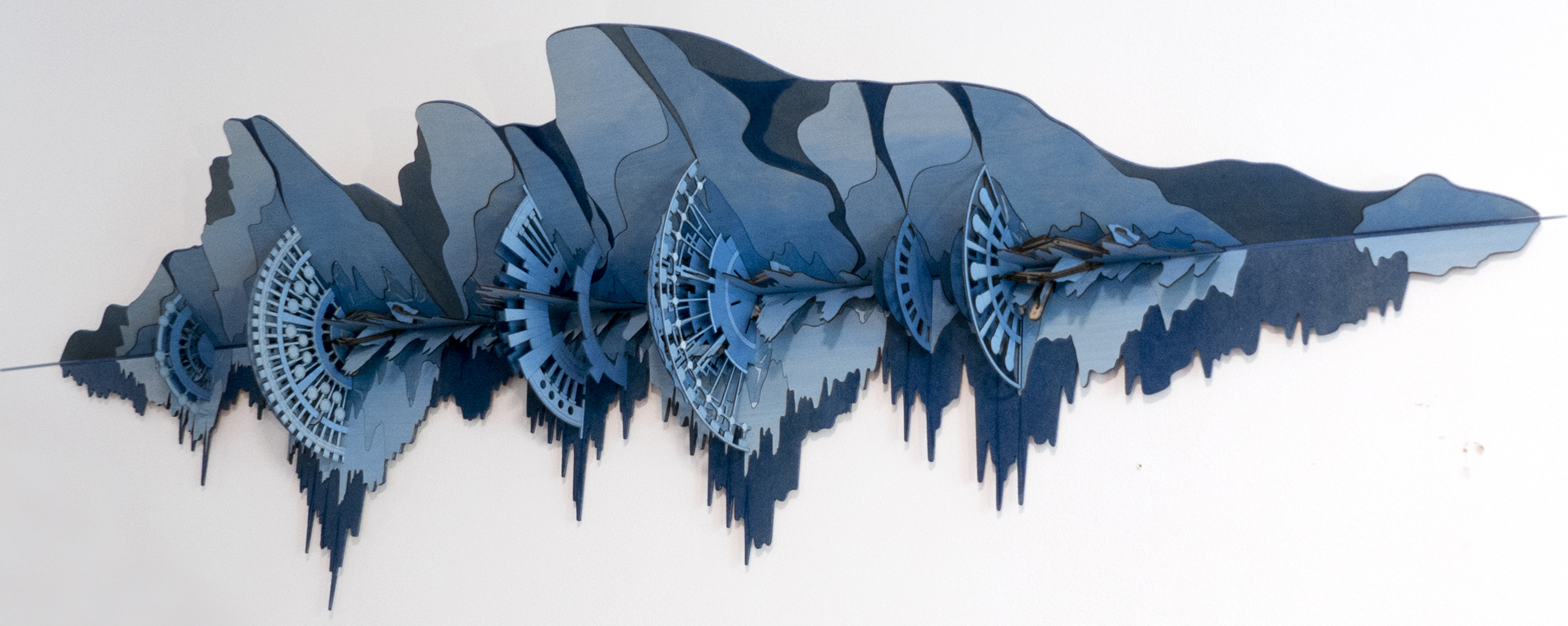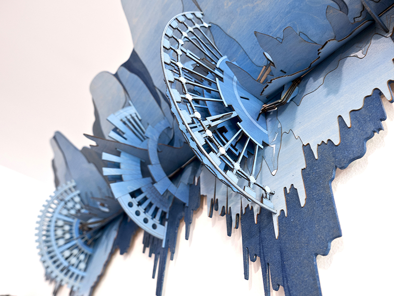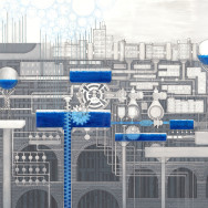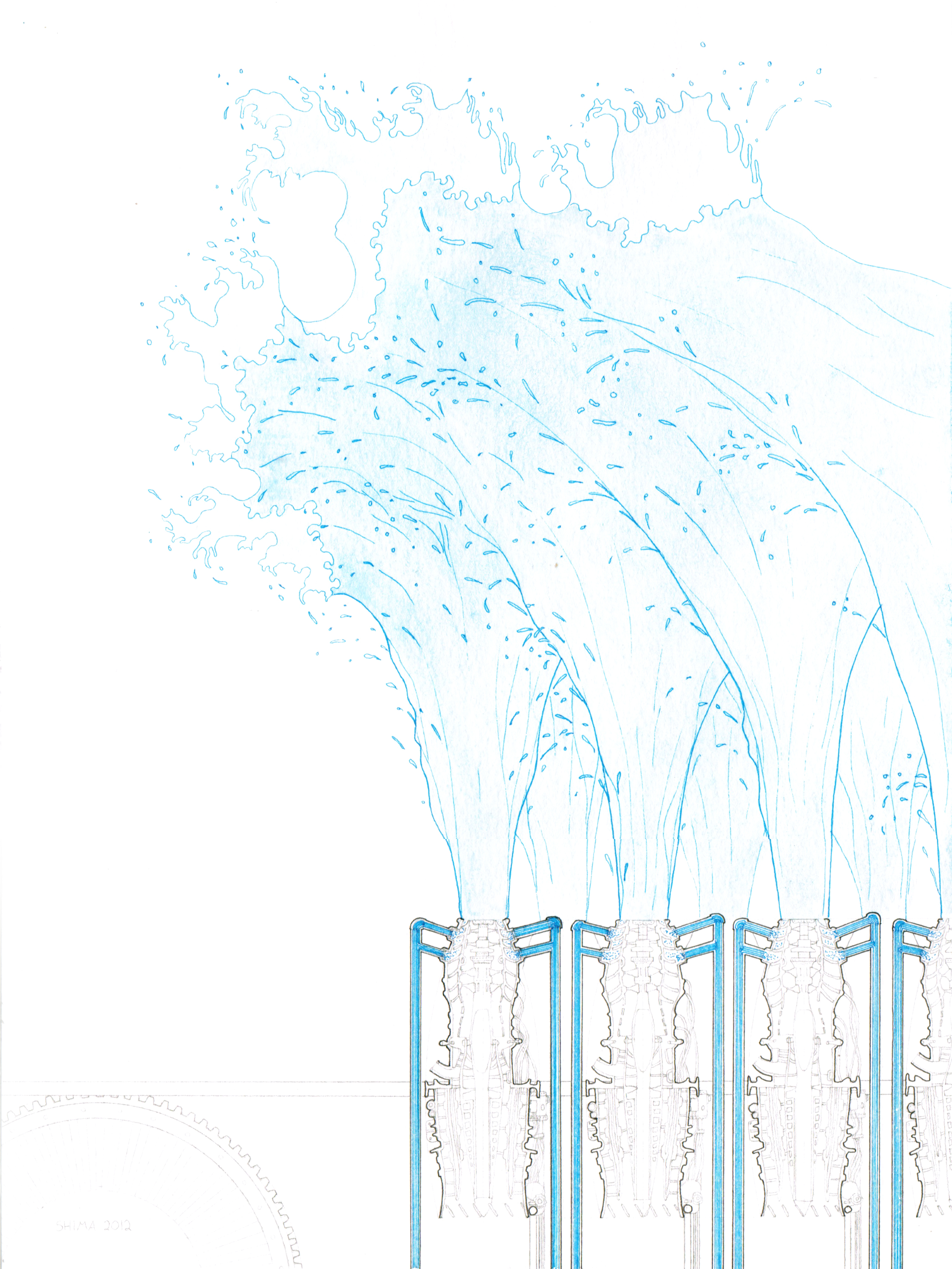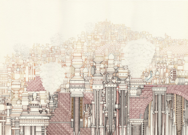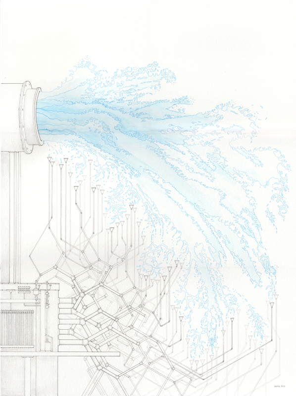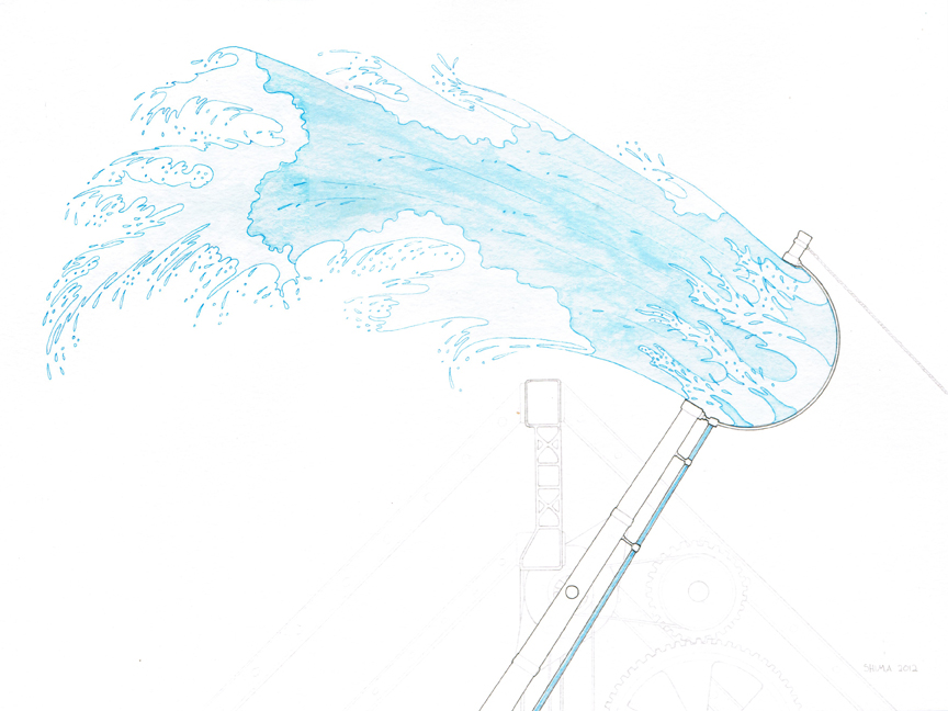 Each scene is grounded in real machines and real processes, either present or past, but employed in fictional or hyperbolic ways. Parts of these mechanical landscapes are drawn with technical accuracy, in section or elevation, like architectural documentation, but the hand-drawn, illustrative quality of the technique adds depth, nuance, and mood, helping to draw out the narratives of the allegorical machines.